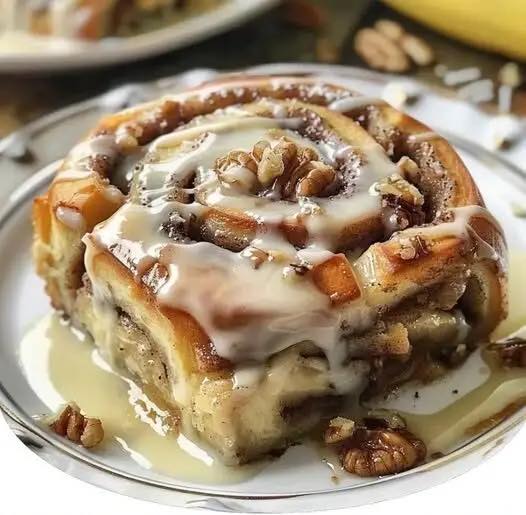 Rouleaux moelleux infusés à la banane, fourrés de sucre à la cannelle et recouverts d’un glaçage crémeux pour un délice sucré pour le petit-déjeuner.