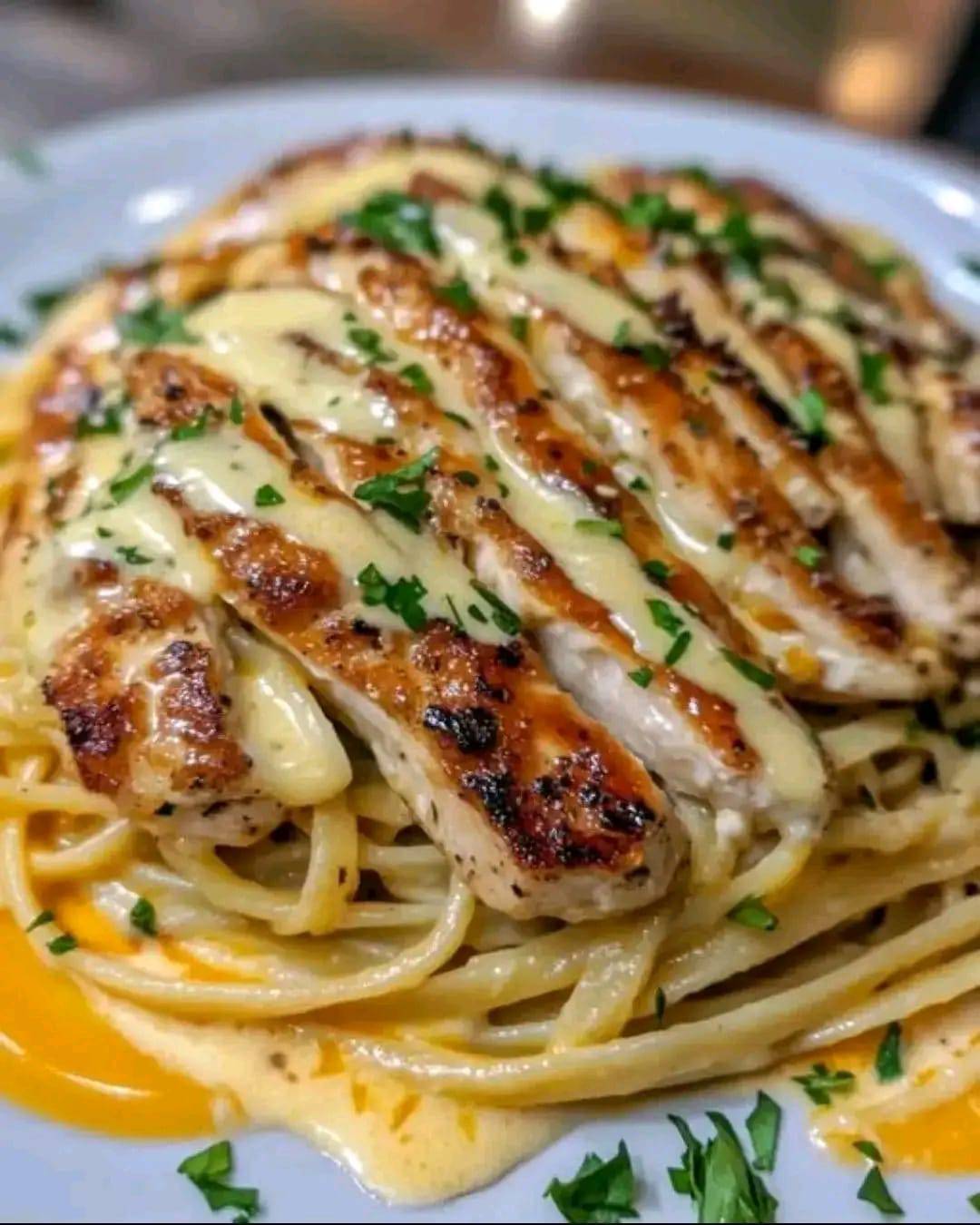 Poulet crémeux au beurre à l’ail et linguines à la sauce Alfredo