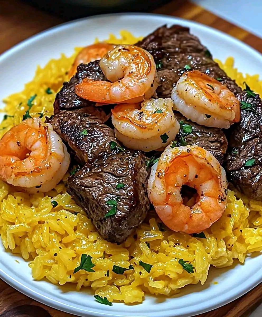 Égrainez le riz au safran et disposez-le sur une assiette. Garnissez-le de tranches de steak et d’une généreuse portion de crevettes.